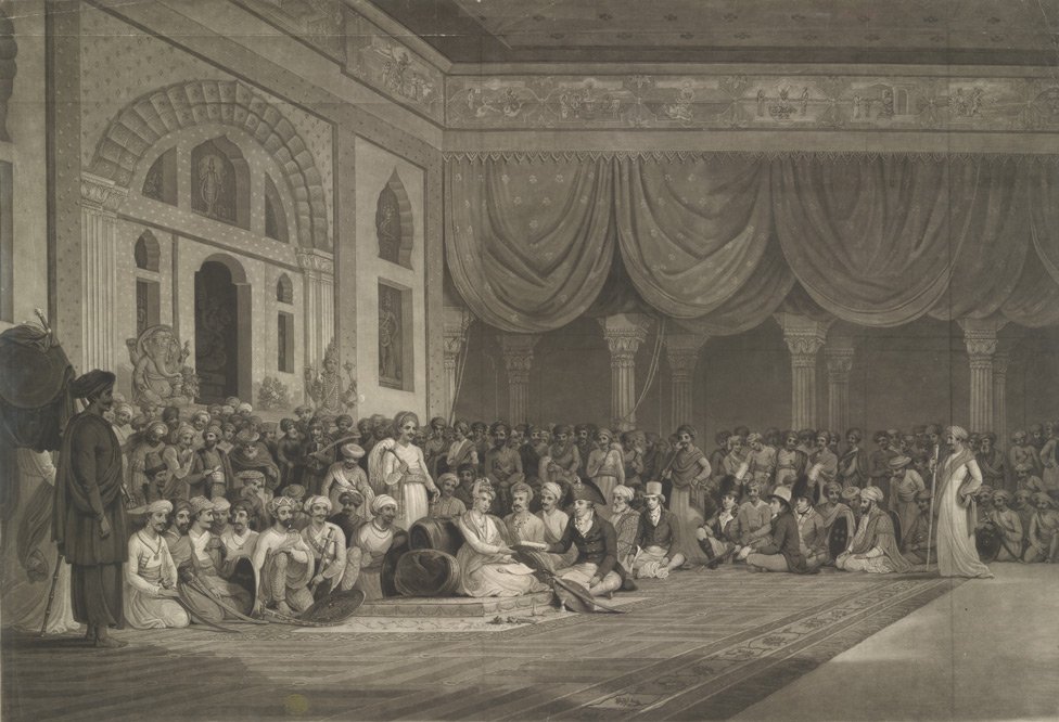 A- देवळाचा दरवाजा, B- लाल रेशमी वस्त्रे घेतलेले दोन सेवक, C-विविध फुलांचे गुच्छ, D-पूजेची निरांजने, E-श्री गणेशाची मूर्ती, F-आसनस्थ पेशवे, G- मंत्री (म्हणजे बहुतेक नाना फडणवीस), H- सर चार्ल्स मॅलेट, I-मिस्टर लॉकहार्ट, J- पानाच्या विड्यांचे तबक, K-वेल्स (स्वतः), L- डॉ. फिंडले (इंग्रज वकिलातीतील सर्जन), M-मिस्टर इमानुएल, N-कर्नल लेडी यांचा मोठा मुलगा, P- सेवक, Q- नृत्य करणाऱ्या स्त्रिया, S-पेशव्यांच्या शेजारी आणि समोर अनेक उच्च दर्जाचे सरदार बसले आहेत, R- नृत्य कलावंतांचा गट, असे वर्णन केले आहे.